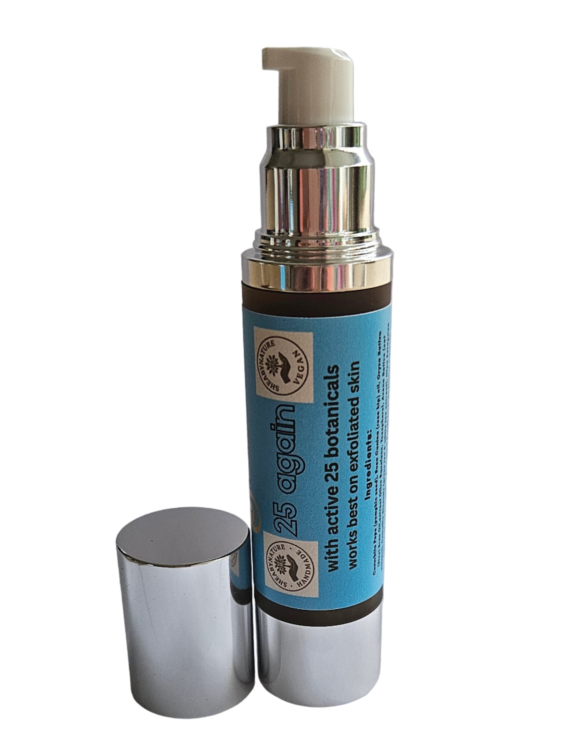 Exfoliate with 25 Again Face and Neck Scrub, then prepare your skin with a clay mask, such as SheaByNature's multi-action green clay face mask, then apply the 25 AGAIN face serum and rub in until absorbed.