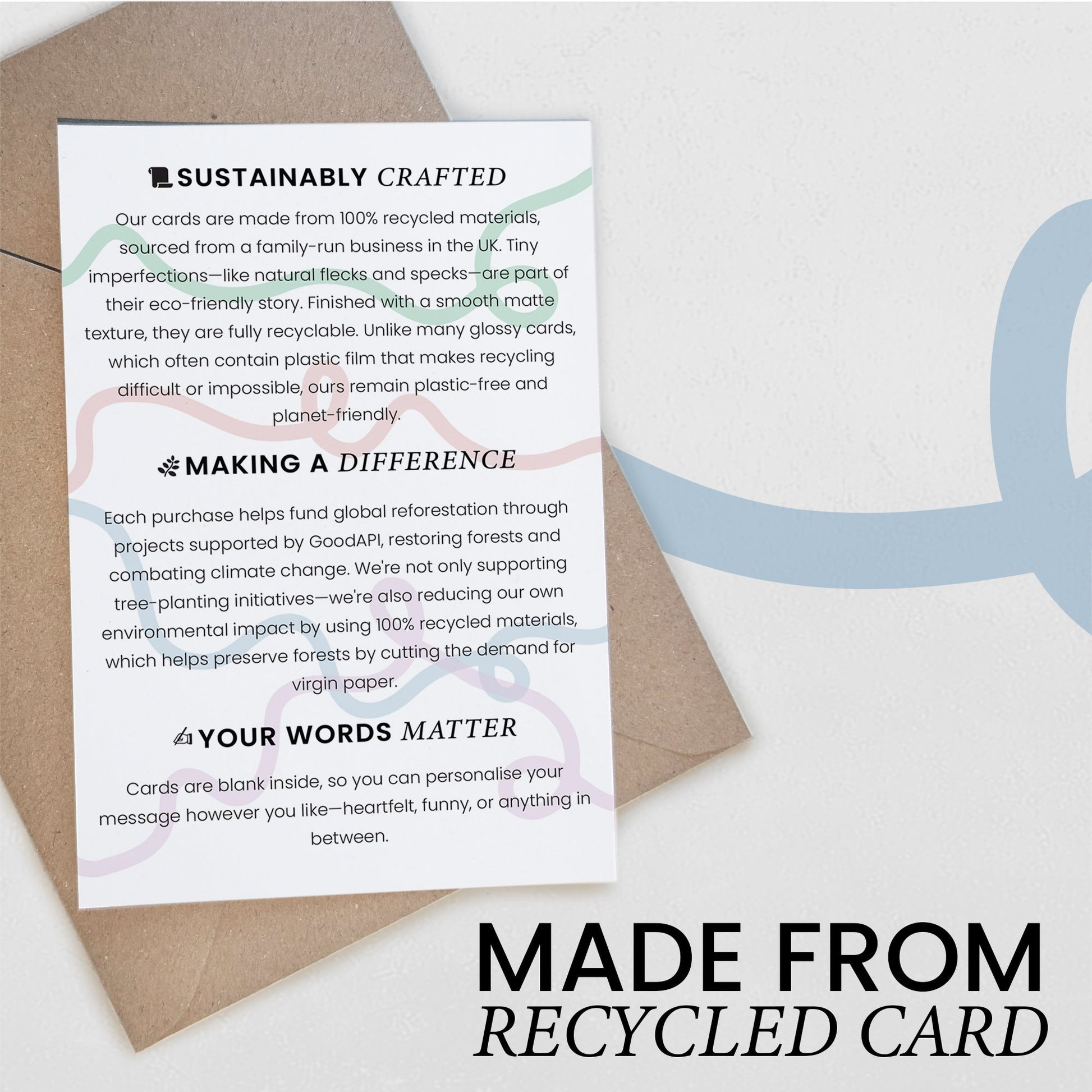 Support Reforestation: With every order, we contribute to tree planting initiatives through Sprout and the Eden Reforestation Projects. Choosing our cards helps replenish the planet's forests, making your celebration part of a larger global impact.