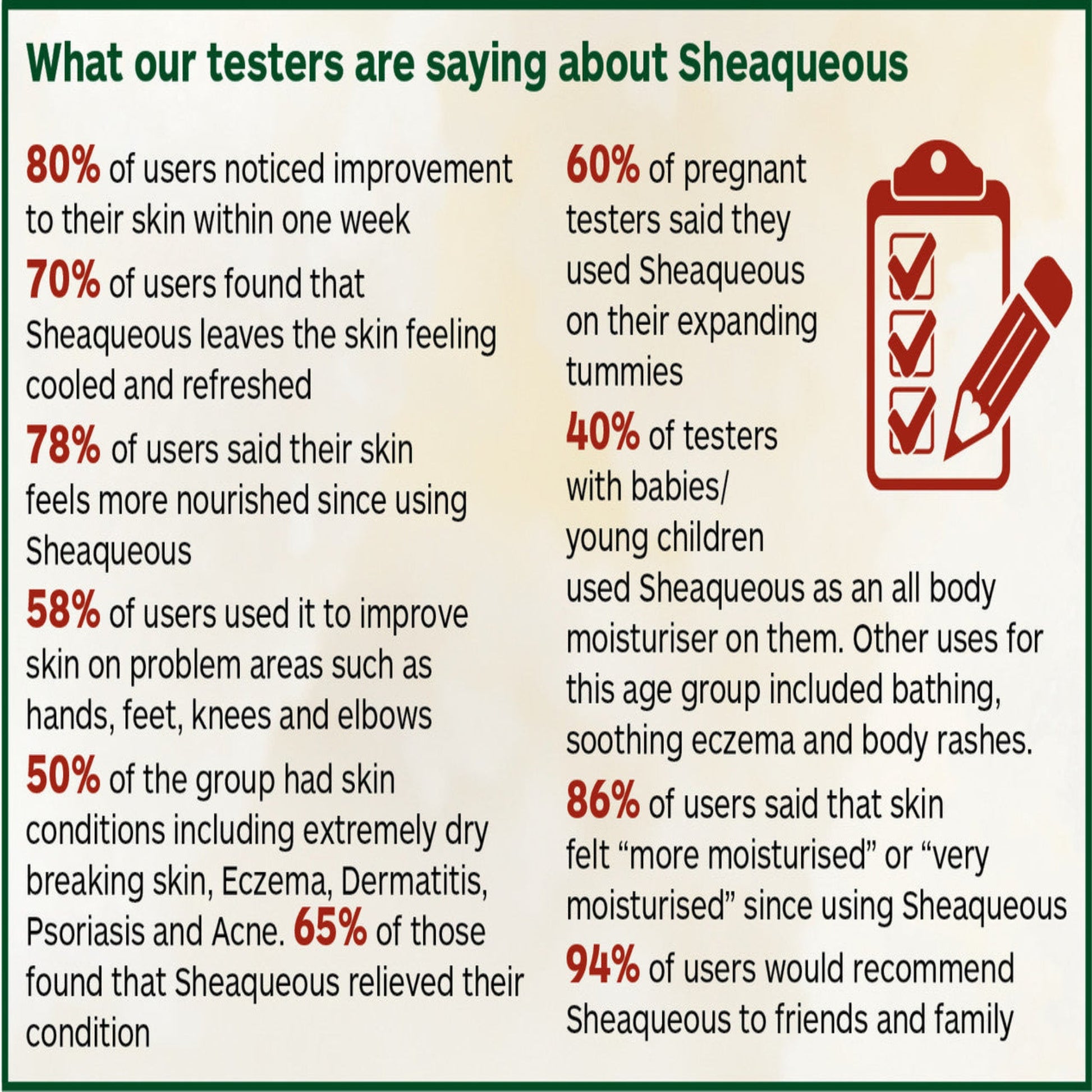 - 93% of testers found it highly effective for dry skin (from official Sheaqueous survey, June 2017).